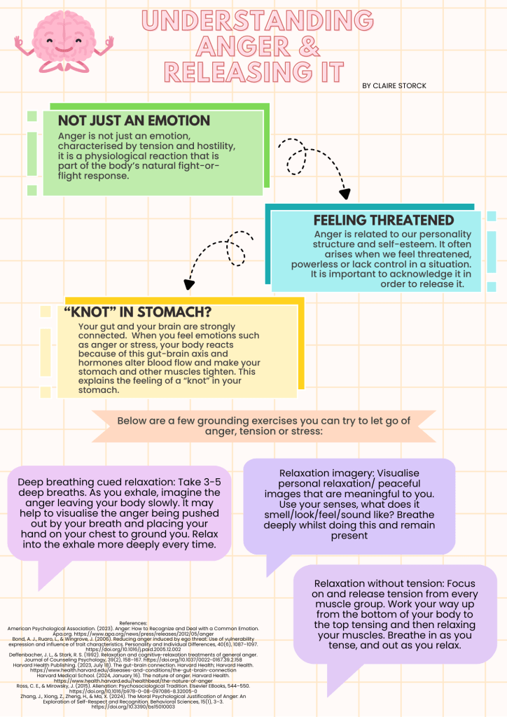 | Claire Storck Wihlidal is currently a trainee and assistant psychologist, in her 3rd year of the undergraduate training in Portsmouth University, and she developed this lovely poster to bring more awareness to the topic of how we can continue understanding anger and realising it. I hope you enjoy it, as I do. Thank you Claire! |